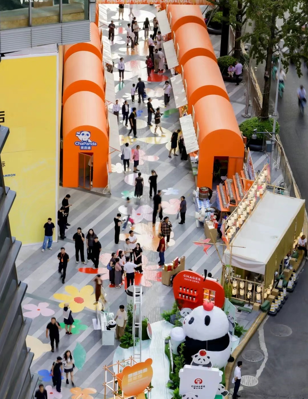 市集展示区人头攒动,洋溢着浓浓的蜀地风情,成都、宜宾、达州、甘孜等地的餐饮、文创、零售等本土品牌齐聚,共同勾勒出新消费的蓬勃画卷。现场,新中国式国风茶饮代表霸王茶姬打造的体验空间融入了极具特色的熊猫和竹子元素,堪称“移动的东方美学馆”,展台上摆满各种特色茶饮,吸引了不少过往市民游客前来打卡拍照。